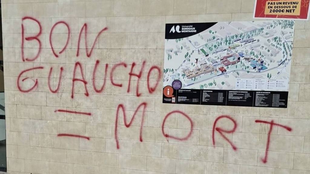 Des tags islamophobes et appelant à la violence ont été découverts sur les murs de l’université Bordeaux-Montaigne, visant à la fois les musulmans et des étudiants engagés à gauche. Parmi les slogans inscrits : « Remigration », « F* Islam » ou encore des messages justifiant la violence et le génocide.